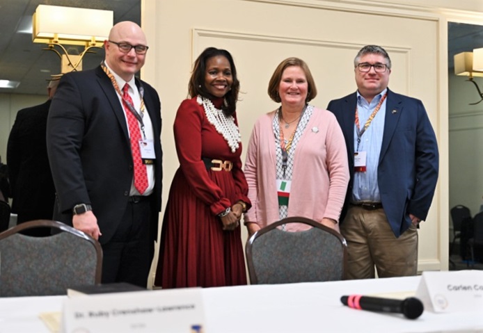 Panelists and moderator from the 2024 SMART PROC GovCon in Frederick, Maryland, on Dec. 10 gather for a photo following the close of their session covering small business contracting with the Defense Intelligence Community. From left to right: Jeremiah Jensen (moderator), Ruby Crenshaw-Lawrence, Carlen Capenos and Brian Shay. (DISA photo by Sam Juan)